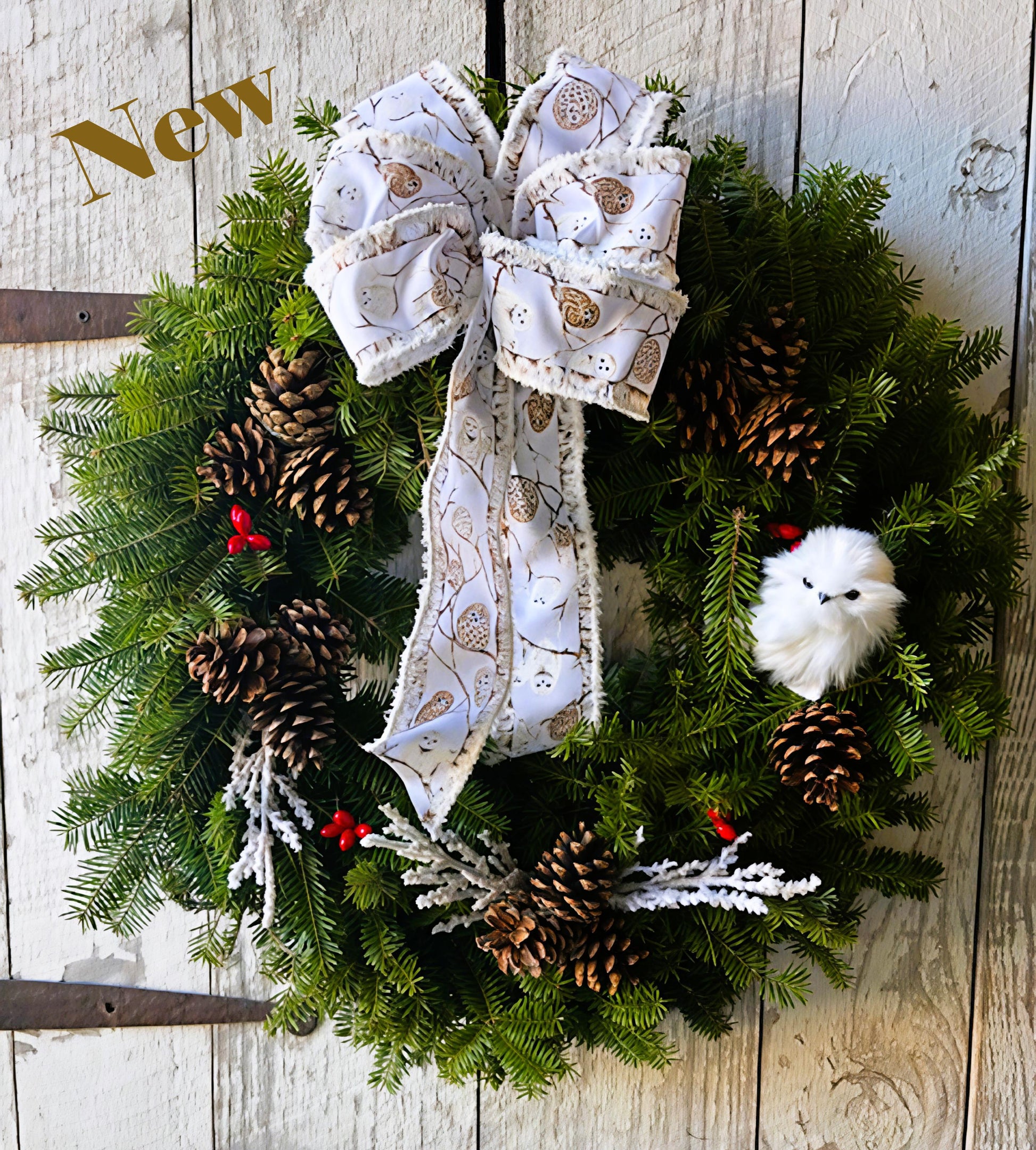 Wreath comes accented with a fury white or brown owl ornament, red berries, white branches, and pine cones and a hand-tied owl bow of your choice.