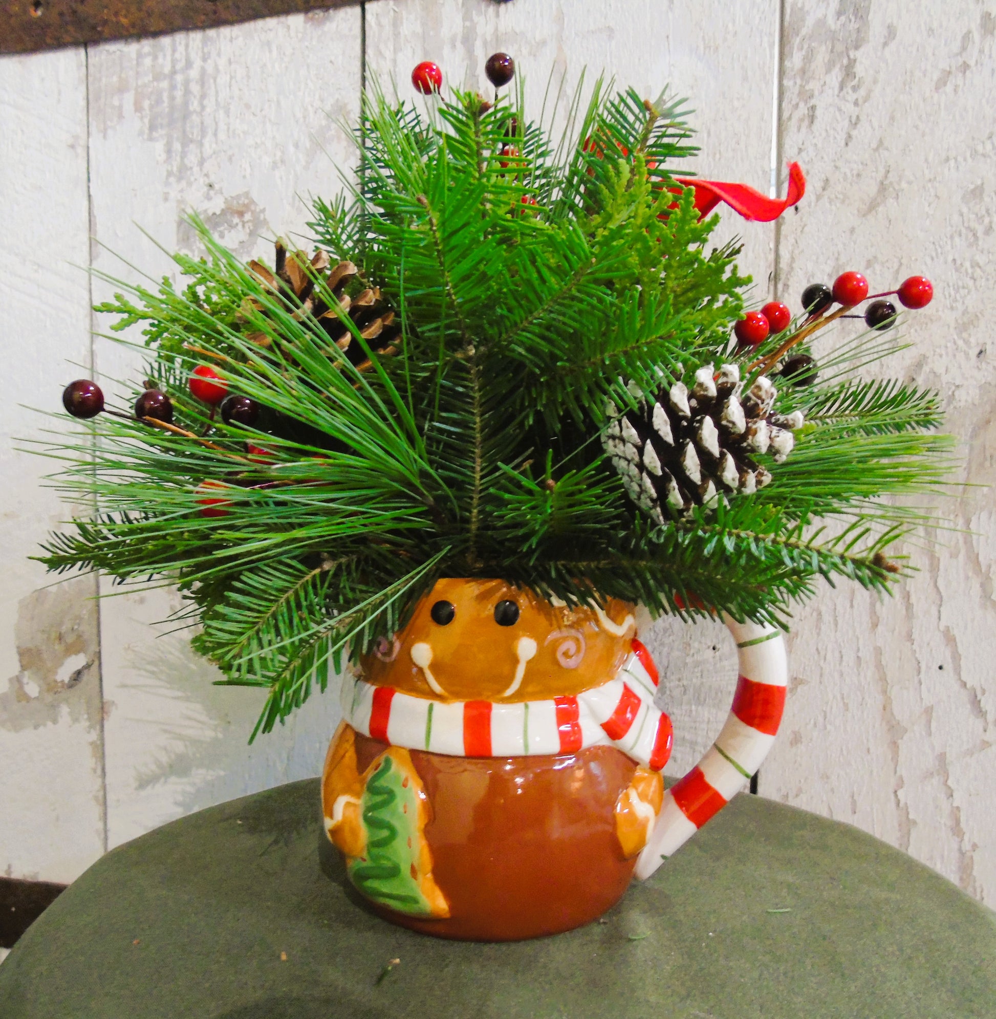 Ceramic Mug Centerpieces: All centerpieces are created using fresh Adirondack balsam fir tips set in floral foam and a dish for ease of watering. Local cedar and pine are added for contrast along with a pinecones, birch branches and berries.