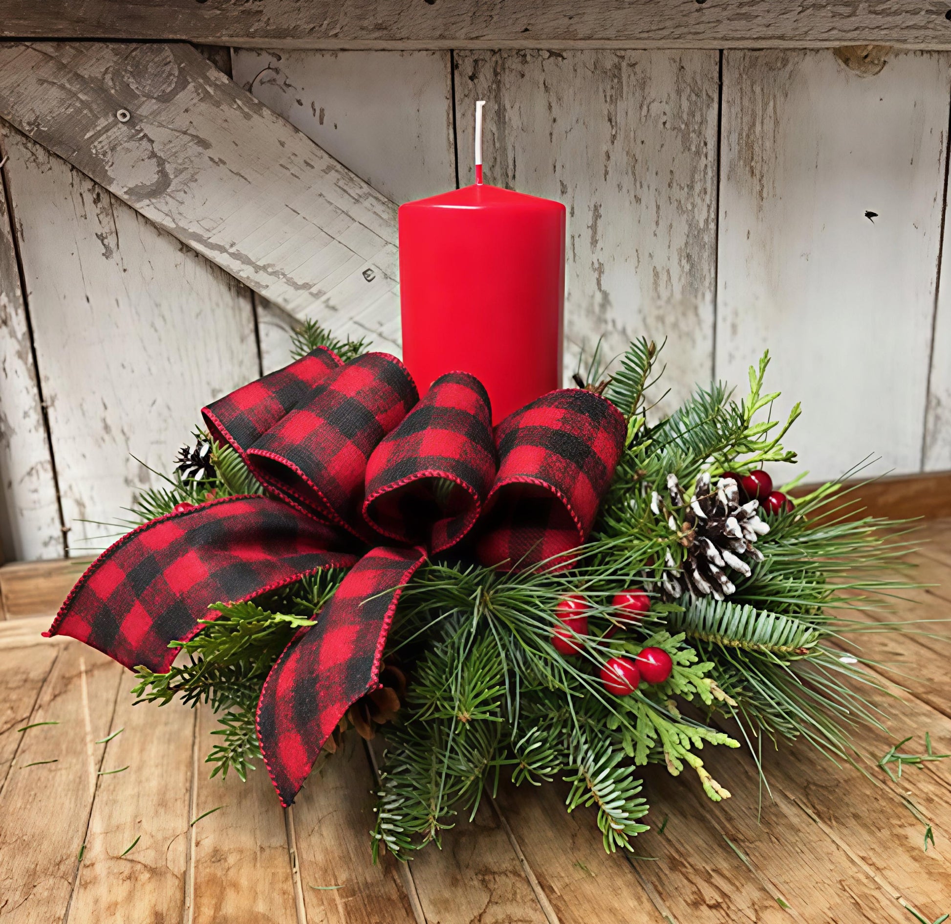 Small Centerpiece: measures approx. 12" with choice of bow (black and white buffalo plaid, red/black buffalo plaid, holly on red velvet, birch, winter berries on burlap, burgundy or red velvet).